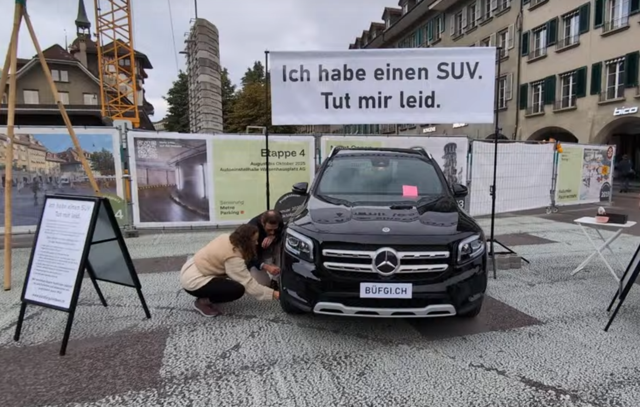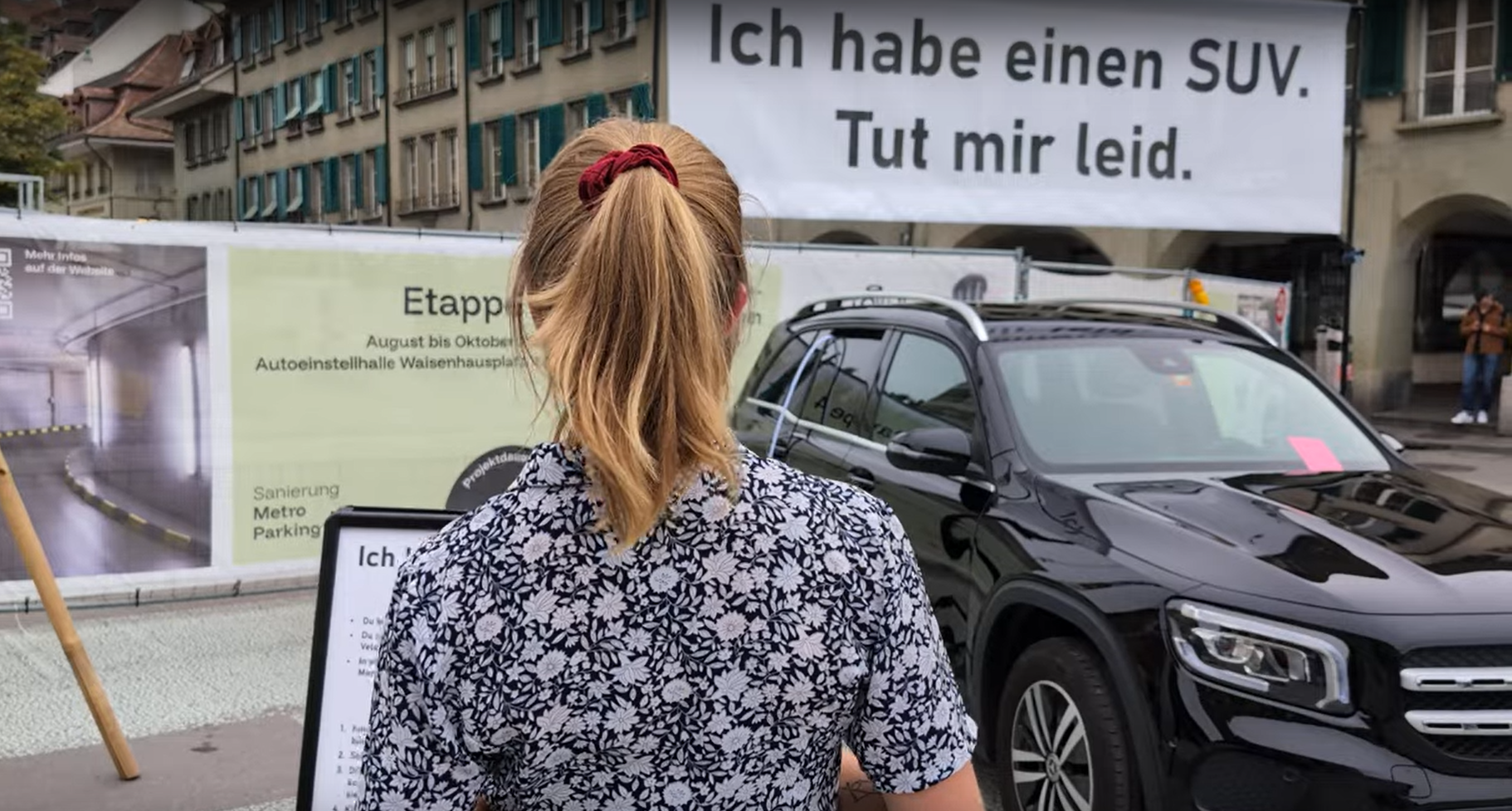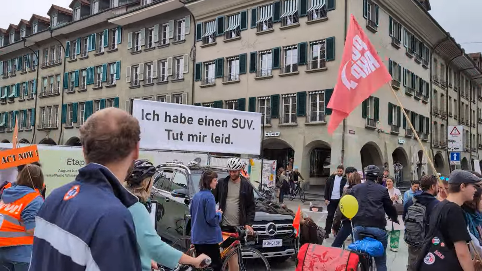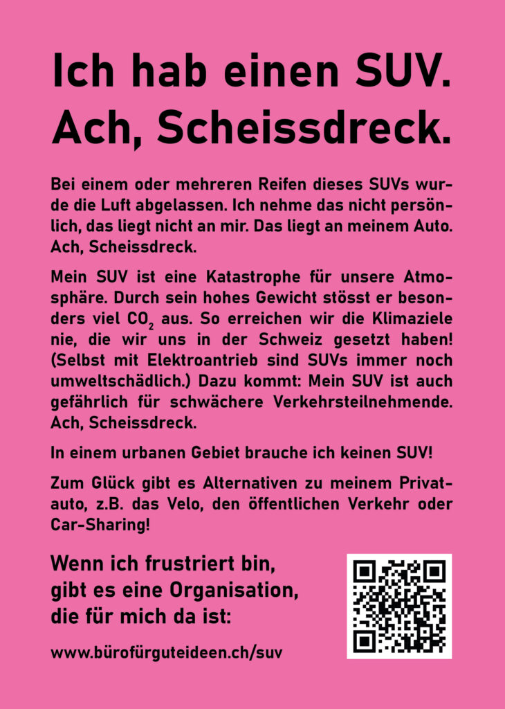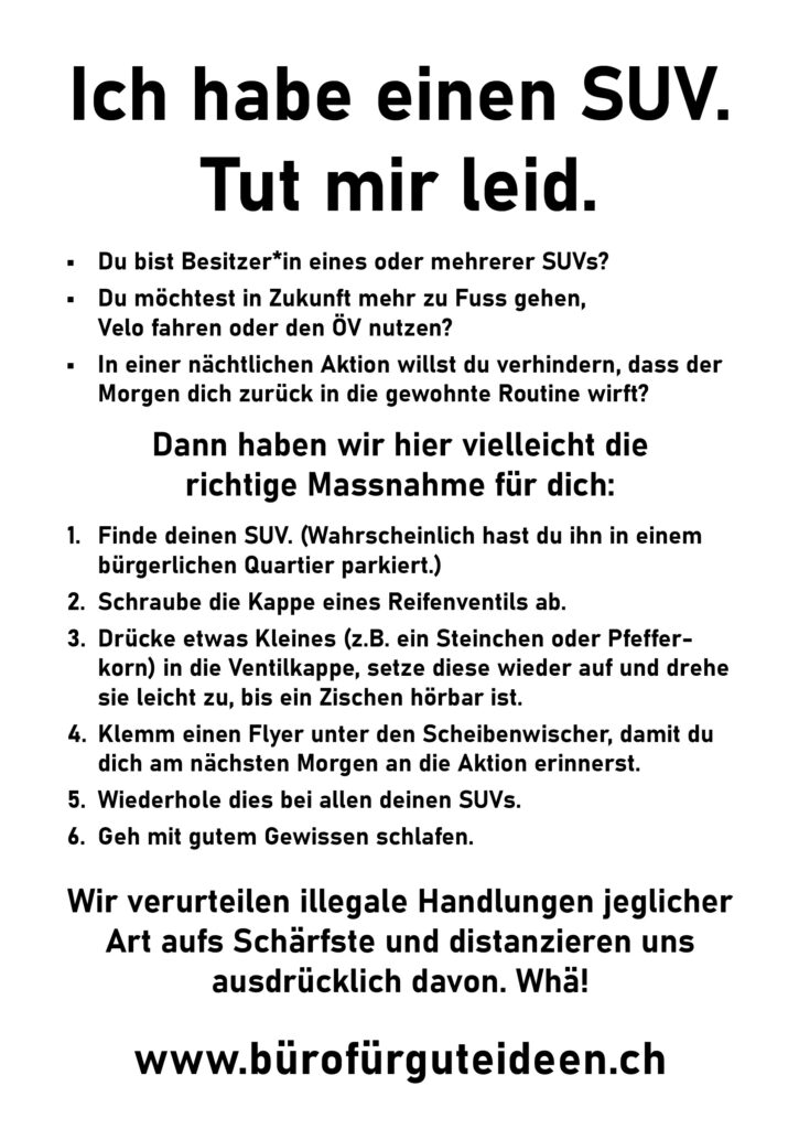 Deshalb gingen wir dahin, wo wir die meisten reuigen SUV-Besitzer:innen vermuteten: an den nationalen Klimastreik in Bern. Mit dabei hatten wir einen richtig schön dicken SUV, an dem Interessierte mal das Lüftelen der Reifen ausprobieren konnten. Wie Plakate erklärten: Natürlich immer mit der Idee, dies heute Abend zu Hause beim eigenen SUV zu machen, um am nächsten Morgen nicht gedankenverloren losbrausen zu können. Um sich selbst an die Aktion zu erinnern, empfehlen wir, immer einen Flyer unter den Scheibenwischer zu klemmen. In diesem verweisen wir unter anderem auf eine einfühlsame Website, die wir extra für Betroffene eingerichtet haben.